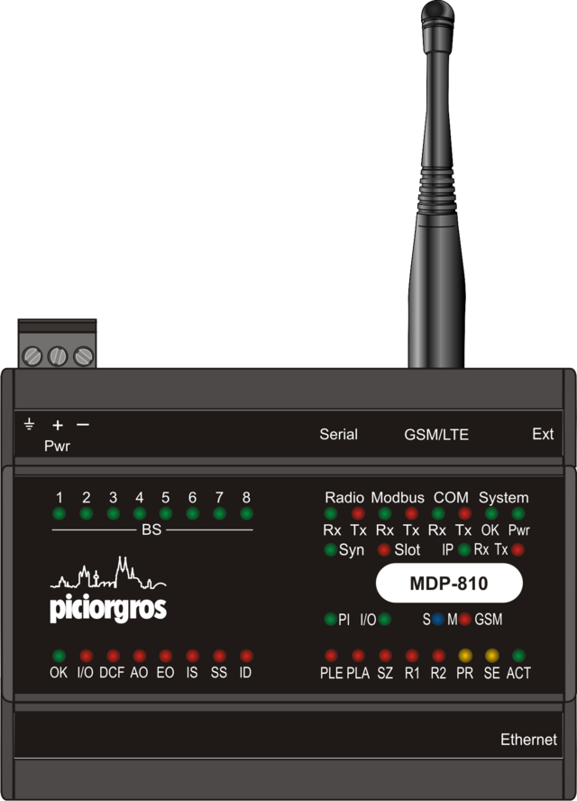 The MDP-810 serves as a radio server and, like its predecessor MDP-310.200, can manage up to 64 remote radio stations of types RTU-810 (I/O radio module), TRM-810 (serial radio modem), SS20F (solar radio station), and LIO (local I/O expansion modules). In addition to these (time-slot) radio devices, the GSM/LTE modules SS20G and GMO-81 can also be queried by the MDP-810.